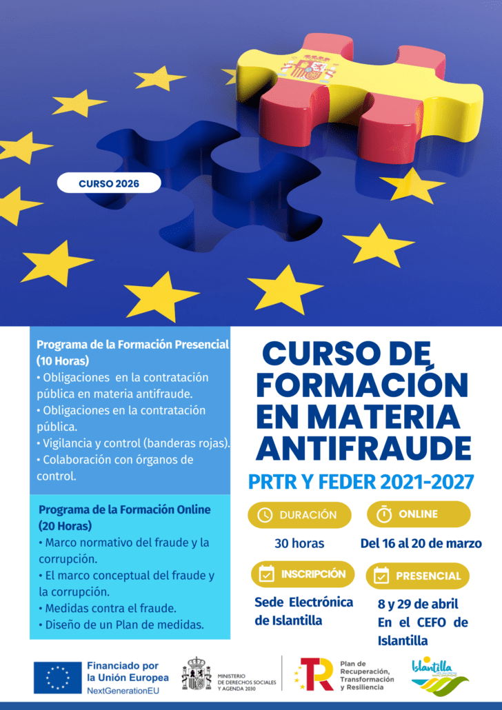 La Mancomunidad de Islantilla pone en marcha una acción formativa especializada en materia antifraude, dirigida específicamente al personal técnico de los Ayuntamientos de Isla Cristina, Lepe y de la propia Mancomunidad. Este curso es una pieza clave para asegurar la correcta ejecución y justificación de los proyectos enmarcados en el Plan de Recuperación, Transformación y Resiliencia (NextGenerationEU) y el nuevo marco plurianual FEDER 2021-2027.