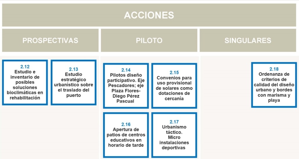- Acciones piloto, que pueden ser acciones de prueba o de experimentación social, como la apertura de patios de colegio en horario de tarde, de cuyo impacto y repercusiones puede derivar en que se desarrollen en todos los centros educativos del municipio.