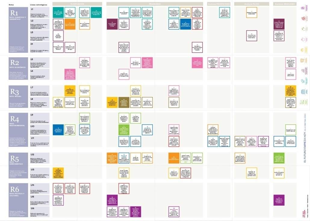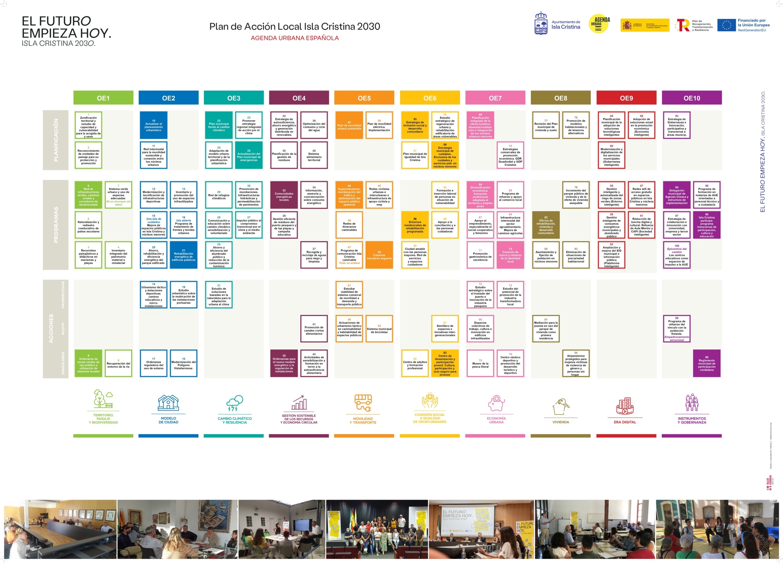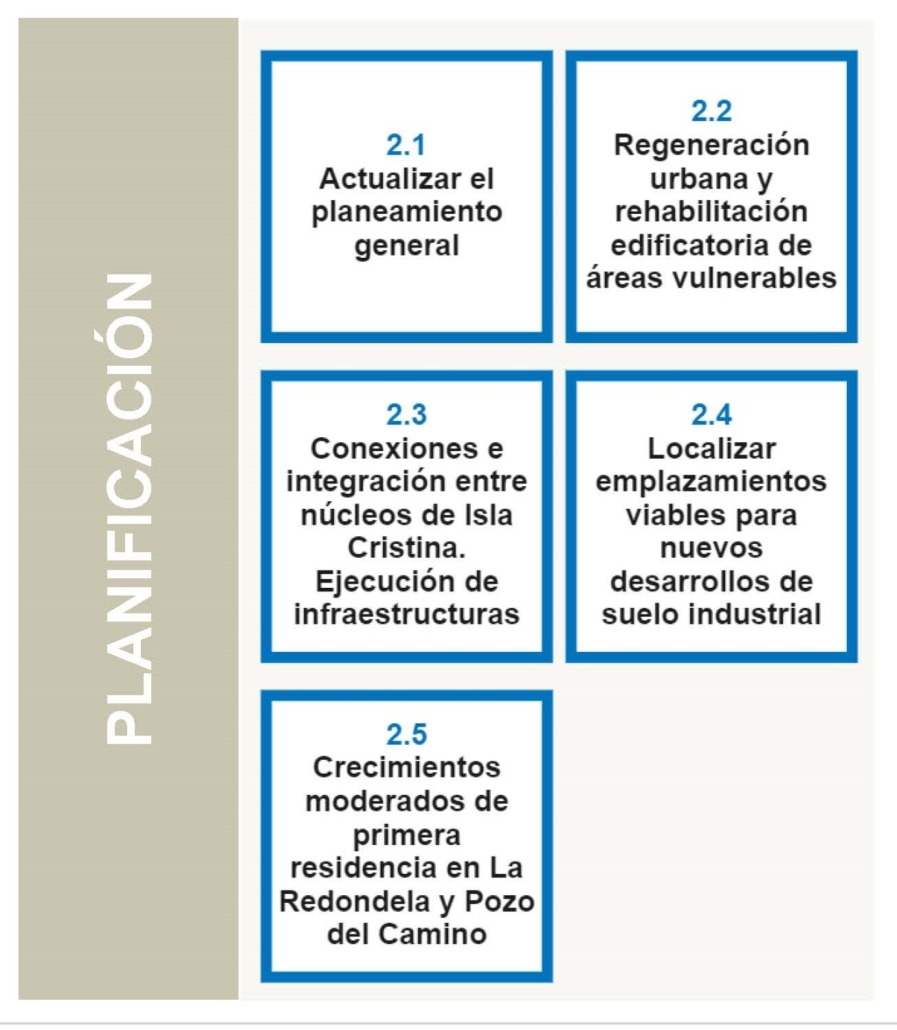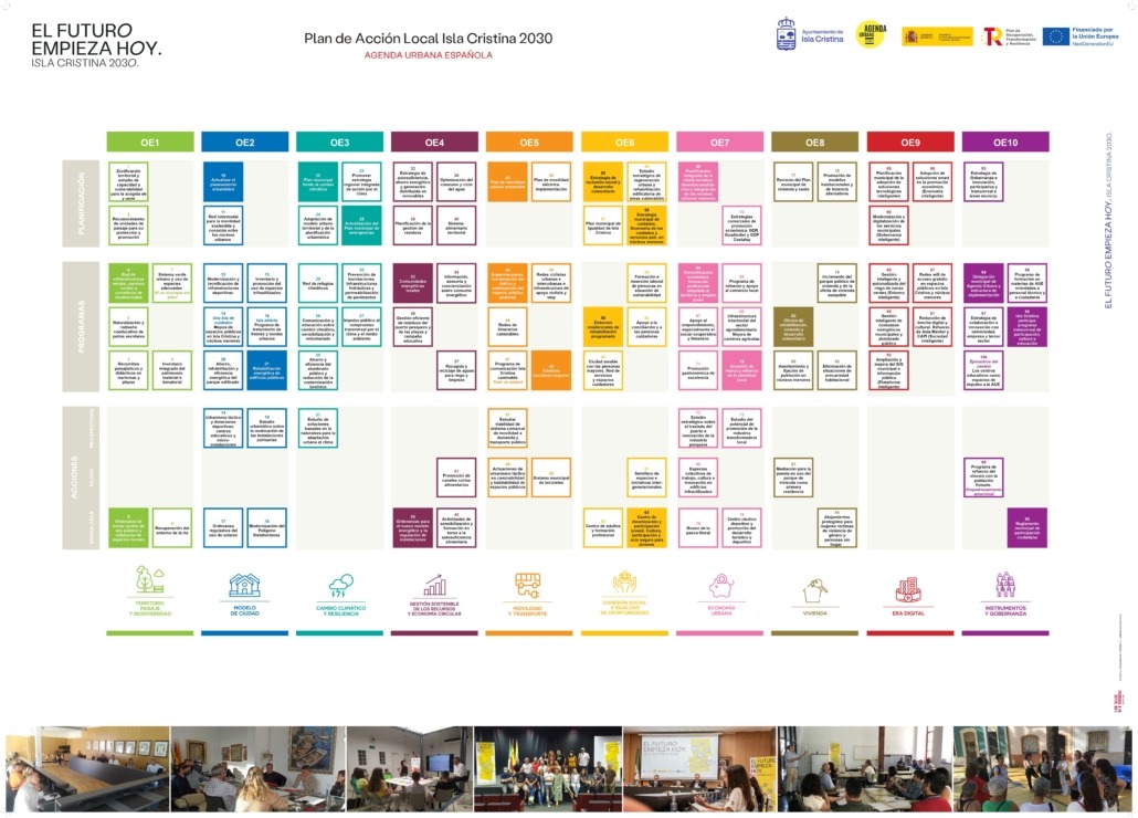 Las acciones del Plan Isla Cristina 2030 se distribuyen en torno a los 10 objetivos estratégicos de la AU Española. Y a su vez, se clasifican en diferentes niveles según su nivel estratégico y/o marco temporal de implementación.