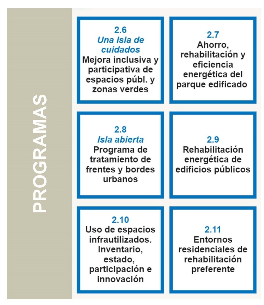 Un segundo nivel de programas, más cercanos y específicos, como pueden ser la Red de Infraestructuras Verdes y Caminos Rurales, un Programa de Rehabilitación de Edificios Públicos, o la creación de la Oficina de Rehabilitación, Acceso a la Vivienda y Desarrollo Comunitario.