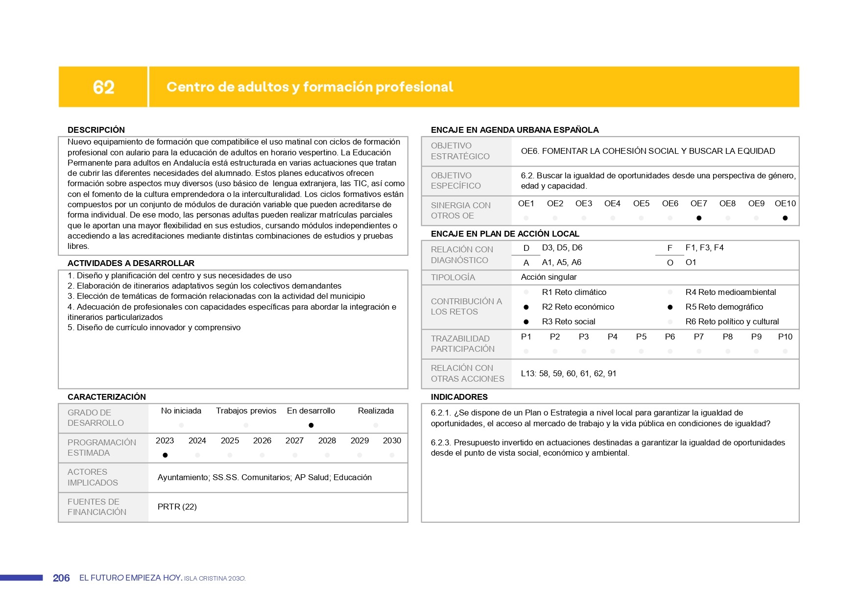 Construcción de equipamiento público destinado a la formación y atención a la ciudadanía, promoviendo la dinamización comunitaria y la inclusión social en una zona prioritaria de transformación del municipio. La intervención abarca las Bda. del Rocío, Jesús del Gran Poder, Plaza Estibadora, Bda. del Cortijo y Los Pisos Blancos, incluidas en el Plan Local de Intervención en Zonas Desfavorecidas 2023-2028. Se crearán dos espacios complementarios: un centro de formación de adultos destinado a la educación de adultos, formación técnica y profesional, obtención del graduado en ESO y preparación para ciclos formativos; y un espacio de dinamización comunitaria dotado de biblioteca, sala de estudios y punto de encuentro para asociaciones y vecinos.